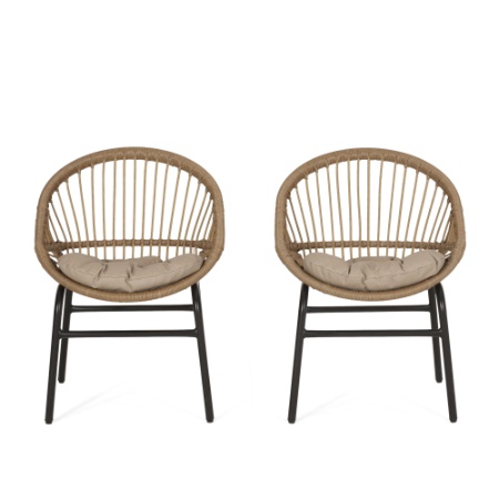 Complement your patio dining area with seating of streamlined style and sophisticated caliber. This set of dining chairs brings together a stunning wicker wrap design with smooth metal frames to create a sleek and comfortable space for your home. With sturdy basket frames, curved backrest, and beautifully textured design, these chairs will have no problem blending into your outdoor decor with their boho style and incredible durability. This chair set is finished with tufted water-resistant cushions for effortless relaxation throughout the summer season