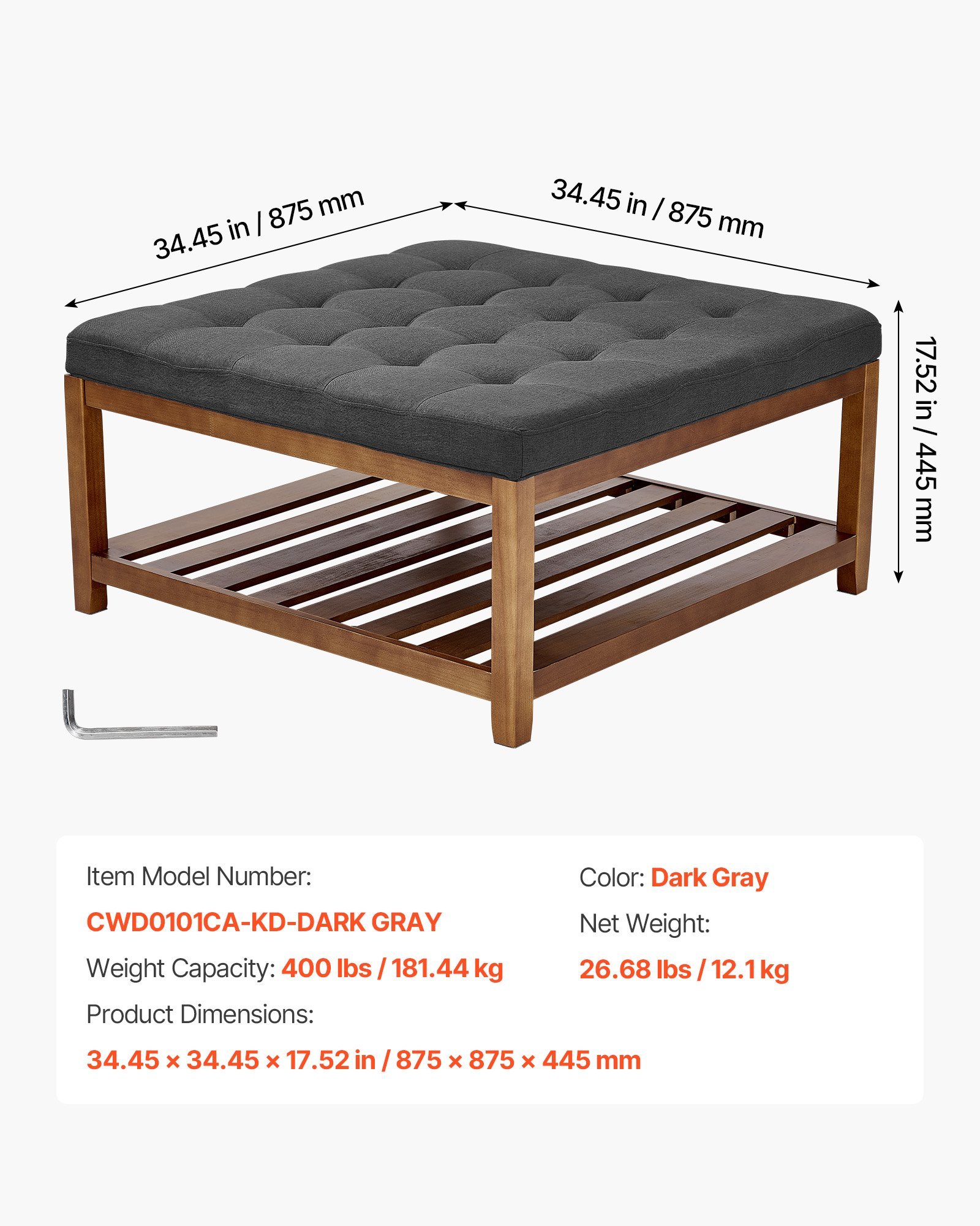 Large Square Ottoman Coffee Table, 34.5 Inch Tufted Coffee Table With Solid Wood Shelf Storage, Linen Solid Upholstered Footrest Ottoman For Bedroom Living Room, 400 LBS, Dark Gray